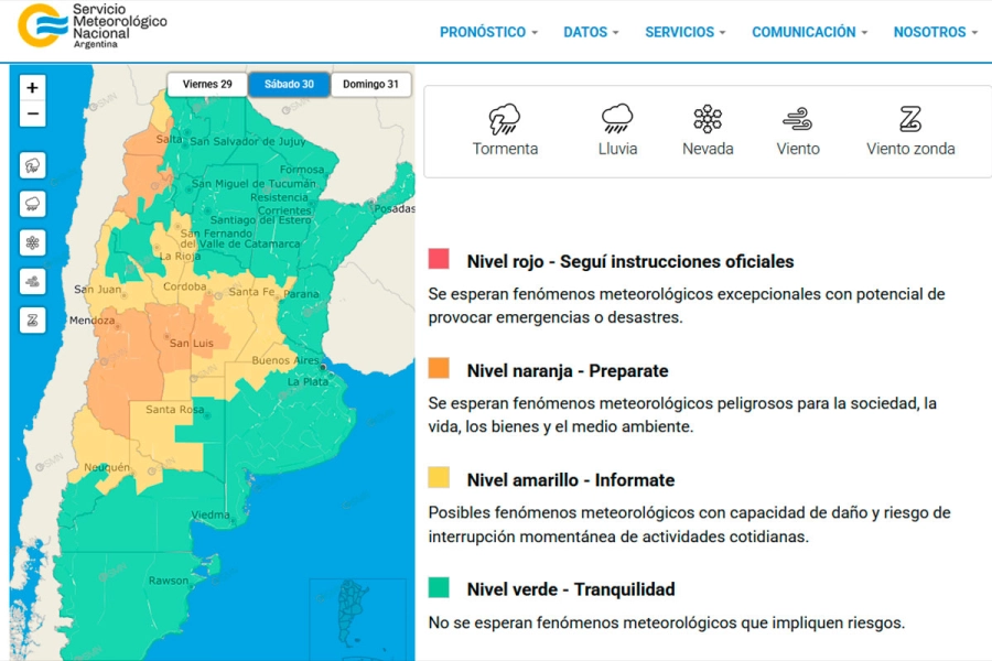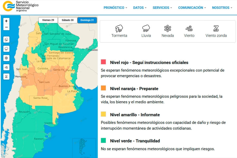 Bajo alerta naranja para el domingo, están diferentes zonas de las provincias de Buenos Aires, Santa Fe, Córdoba, San Luis, Mendoza y San Juan.