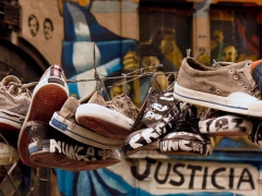 Las decenas de cuerpos esparcidos sobre la calle exterior y las pilas de zapatillas perdidas y quemadas se convirtieron en un símbolo de la desidia y la memoria de los fallecidos.