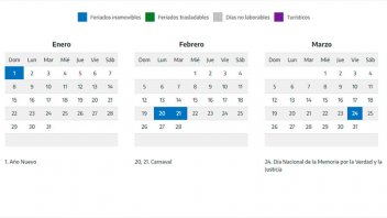 El año que viene tendrá 14 feriados inamovibles, dos trasladables y tres con fines turísticos, lo que contabiliza un total de 19 días festivos. Los feriados turísticos para el año próximo que serán 26 de mayo, 19 de junio y 13 de octubre.