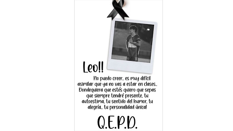 Además, la docente manifestó su pésame a los padres y a Giovanna, la hermana de Leonardo que también es alumna del colegio. “A los padres y hermana de Leo, mi querida Gio, mis más sentidos pésames. Que Jesús sea quien cuide de sus pensamientos, sentimientos y emociones”, expresó.