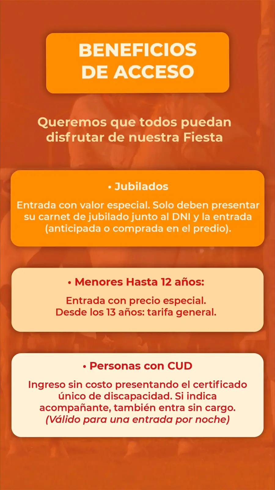 La programación completa contempla una amplia variedad de actividades culturales y recreativas para toda la familia. Además, los organizadores informaron sobre los beneficios de acceso: jubilados, menores y personas con discapacidad cuentan con entradas reducidas o acceso especial al predio.