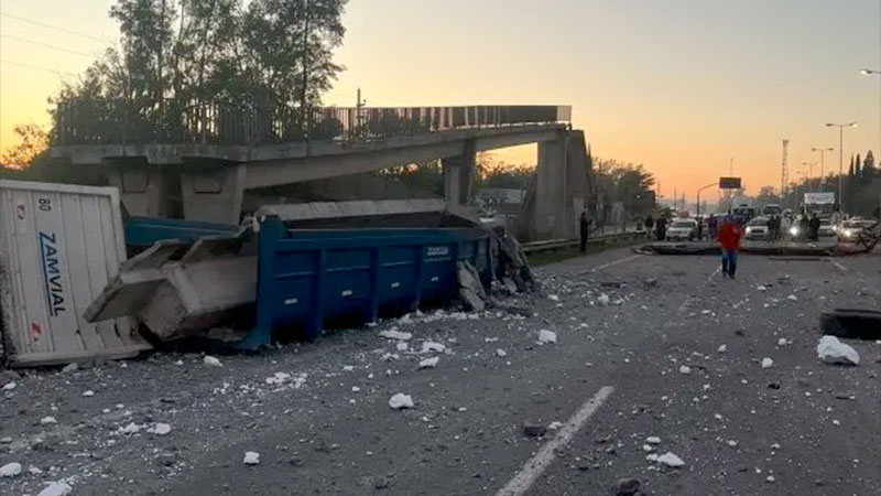 Un camión chocó y derribó un puente peatonal en la Autopista Panamericana este lunes por la mañana a la altura del kilómetro 60 de la ruta 8 sobre el ramal de Pilar. El camionero y el conductor de otro auto sufrieron heridas leves.