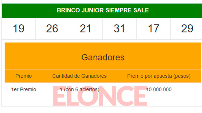 <b>En el caso del Brinco Junior, 19-26-21-31-17-29 fueron los números sorteados. En este caso, hubo un solo ganador y es oriundo de Paraná. Jugó su boleta en la agencia 1307/00, ubicada en calle Gobernador Crespo y se llevó $10.000.000 tras acertar todos los números.</b>