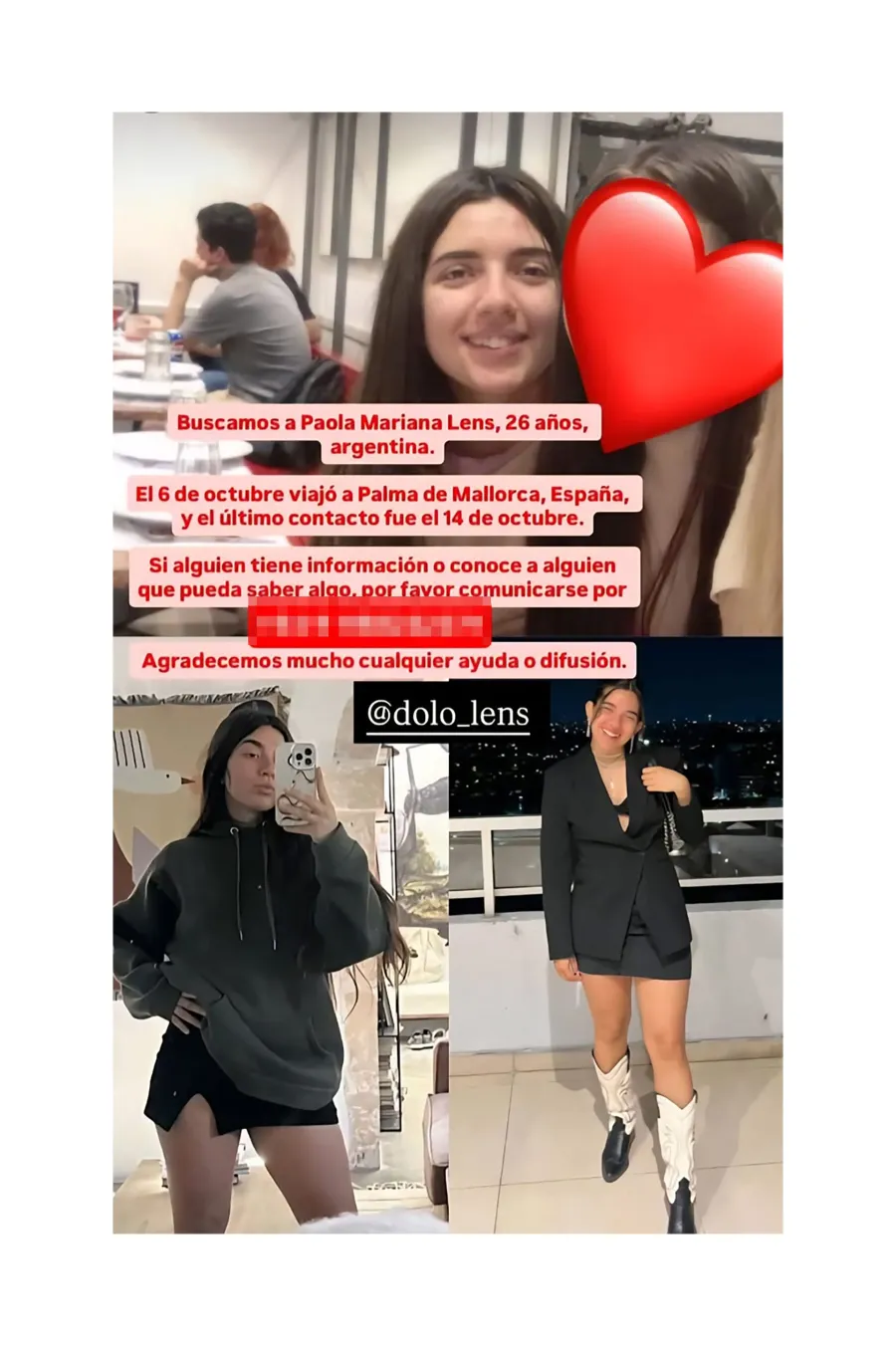 La familia de Paola Lens continúa pidiendo ayuda internacional para su búsqueda y solicita a quienes puedan aportar información que se comuniquen con el Consulado argentino en Palma de Mallorca.
