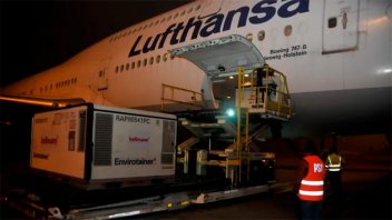 Esta tarde, un nuevo lote de 768.000 vacunas del laboratorio chino Sinopharm arribó al Aeropuerto Internacional de Ezeiza a bordo del vuelo LH8264 de la empresa Lufthansa.