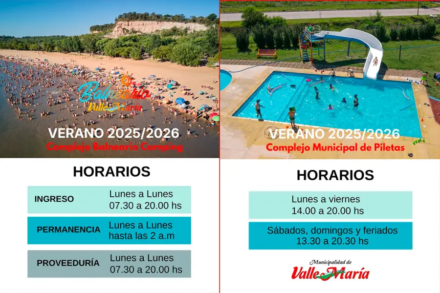 La Municipalidad de Valle María dejó inaugurada la temporada de verano 2025/2026 y quedaron habilitados el Complejo Balneario Camping y el Complejo Municipal de Piletas, para que vecinos y visitantes puedan disfrutar del agua, el descanso y las actividades al aire libre.