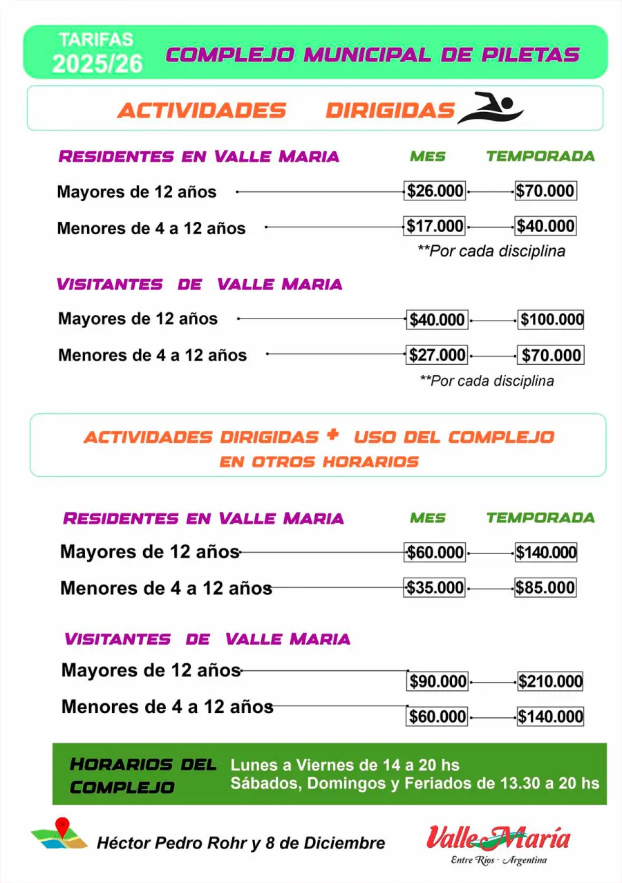 Al mismo tiempo, informaron que a partir de este viernes entraron en vigencia las tarifas correspondientes a la temporada 25/26 en el Complejo Balneario Camping y al Complejo Municipal de Piletas.