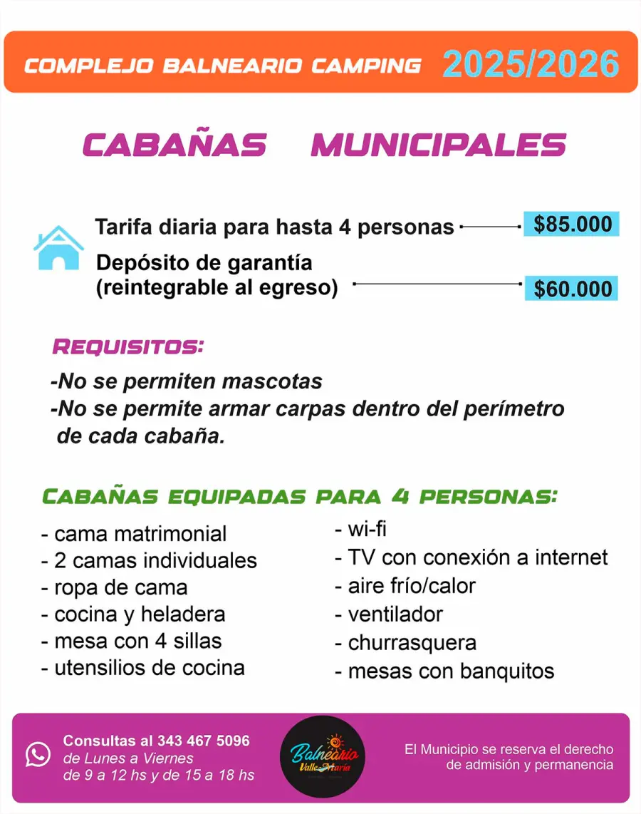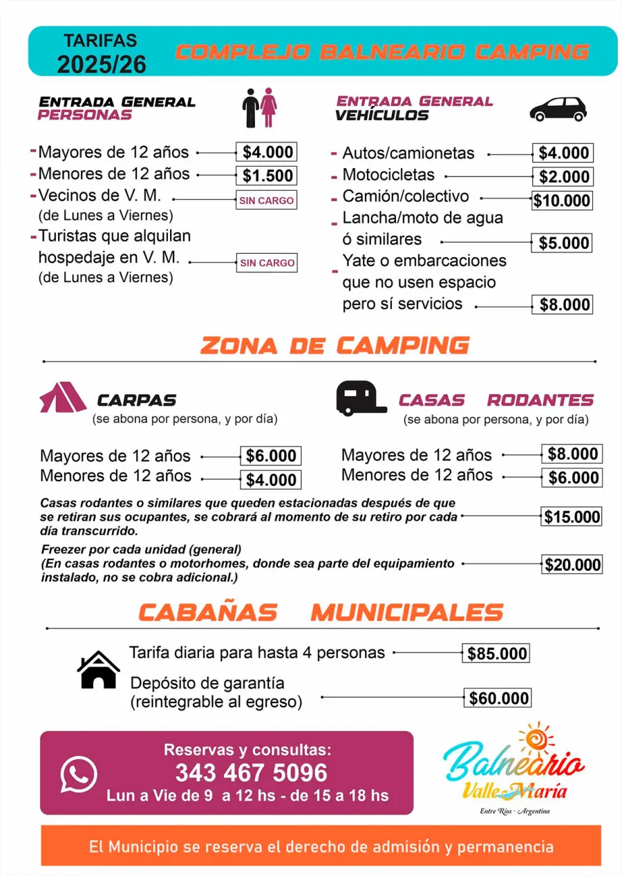 El número para consultas vía WhatsApp sobre el Balneario-Camping es: 343 467 5096.