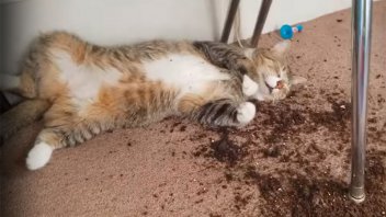 Al seguir el rastro de la tierra que estaba desparramada por todos lados, encontró la causa del incidente. Uno de sus gatos, que evidentemente se había comido las hojas, estaba tirado debajo de una silla, con las extremidades extendidas. Apenas se movía.