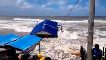 En las imágenes que circulan en las redes puede observarse la crecida del mar sobre la zona de carpas que derribó una estructura de madera.