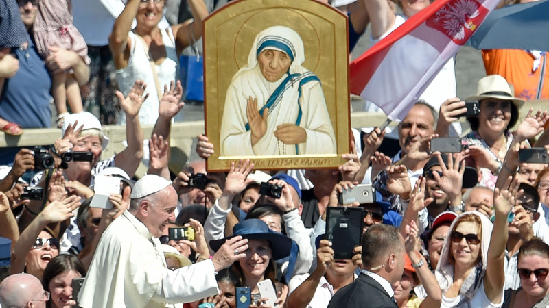 En la homilía de la ceremonia de canonización celebrada en la plaza de San Pedro ante 100.000 personas, el papa destacó que la madre Teresa, durante toda su vida, estuvo "a disposición de todos por medio de la acogida y la defensa de la vida humana, tanto la no nacida como la abandonada y descartada".